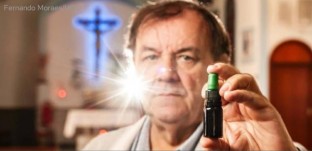 Padre Antonio Luis Marchioni, acima segurando um frasco de óleo de maconha, é pároco da Igreja Católica São Francisco de Assis em Ermelino Matarazzo, na cidade de São Paulo.